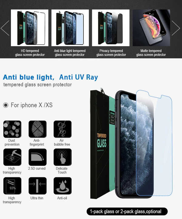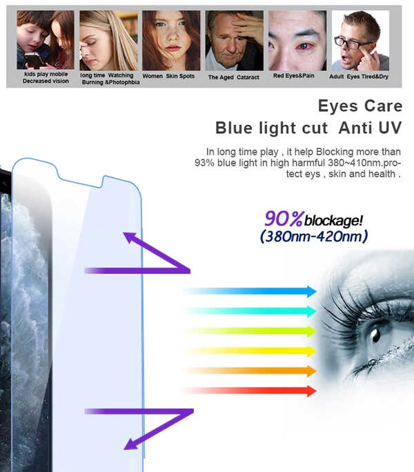 Filtro luce blu: tecnologia di filtraggio della luce blu di alta qualità, che rimuove la luce blu dello schermo del telefono per aiutare ad alleviare gli occhi da affaticamento e stanchezza. Mantiene i tuoi occhi più sani fissando lo schermo per lunghi periodi di tempo.
